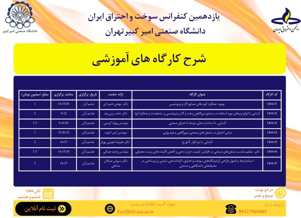 1404/08/08 15 روزیازدهمین کنفرانس سوخت و احتراق ایران، امسال با مجموعهای از کارگاههای تخصصی آموزشی همراه خواهد بود که با هدف ارتقای دانش علمی و عملی شرکتکنندگان در حوزههای مرتبط با سوخت، احتراق، انرژی و ایمنی صنعتی طراحی شدهاند. این کارگاهها فرصتی بینظیر برای یادگیری مستقیم از اساتید برجسته دانشگاهی و متخصصان صنایع نفت، گاز و پتروشیمی فراهم میکنند و امکان آشنایی با آخرین دستاوردهای علمی و فناوریهای نوین را برای شرکتکنندگان ایجاد میکنند. توضیحات تکمیلی و جزییات کارگاه ها در فایل پیوست آورده شده اند.